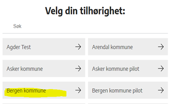 I «Velg din tilhørighet» må du velge Bergen Kommune første gang du logger inn.