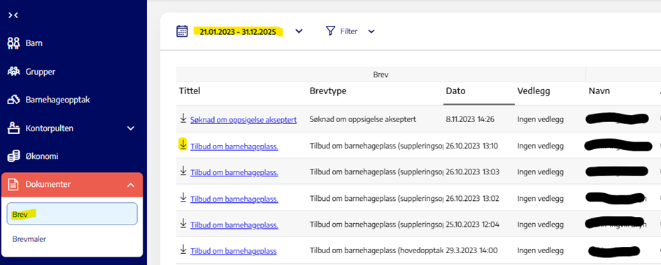 Gå til «Dokumenter» i venstremenyen og trykk på «Brev». NB! Kontroller at datoene er relevante. Finn det riktige tilbudet ved å sjekke navnkolonnen og trykk på pilen for nedlasting