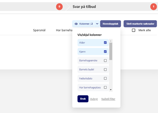 Valg av kolonner kan gjøres i alle faner i «Barnehageopptaket». Vær oppmerksom på at kolonner er synlige når de ikke er markert. Ved å markere kolonner skjules de fra oversikten. I eksempelet under er kolonnene «Alder» og «Kjønn» skjult fra oversikten.