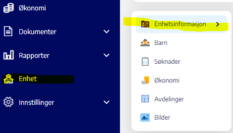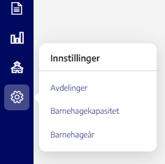 Her legger du inn barnehagens åpningstider. Hvis dette ikke er utfylt får du feilmelding hvis du prøver å endre opplysninger i forhold til plasseringer som oppstartdato og avdelingsbytte. Dette må også være utfylt for at kontantstøtterapporteringen skal fungere.