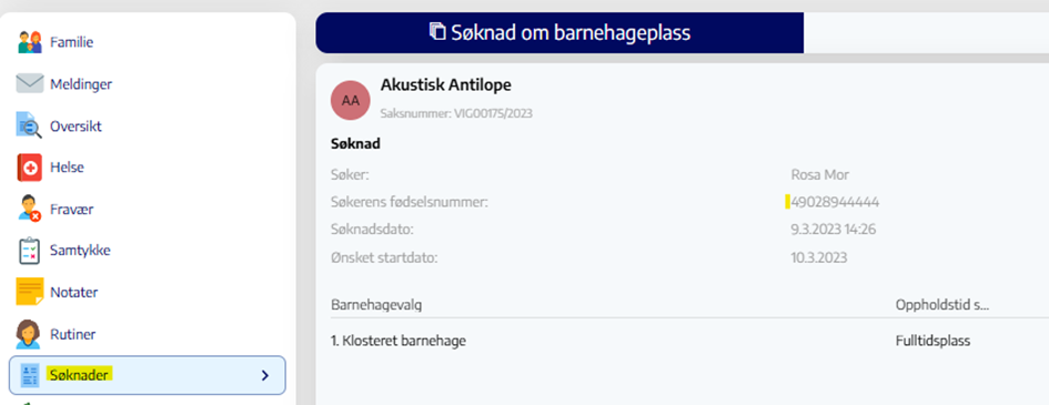 Gå inn på "Søknader". Søkerens fødselsnummer her er et fiktivt nummer opprettet etter barnehagemyndighetens rutine. Det starter med 49, og inneholder 5 tall etter en gitt kode til slutt (reell fødselsdato her er 9.februar 1989):