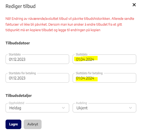 NB! Dersom sluttdato settes til 1. i måneden og det sendes faktura fra Vigilo vil det sendes ut faktura for en dag. For å unngå dette: sett sluttdato til siste dag i måneden før.