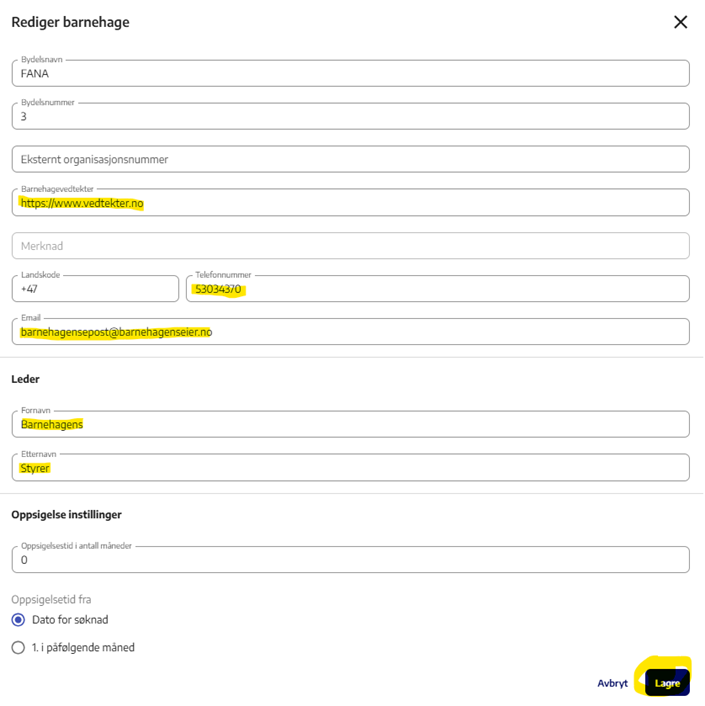 Opplysninger om barnehagen hentes fra UBAS/NBR. Opplysninger om barnehagens styrer, barnehagens telefonnummer og epostadresse hentes ikke inn derfra og må registreres og oppdateres manuelt.