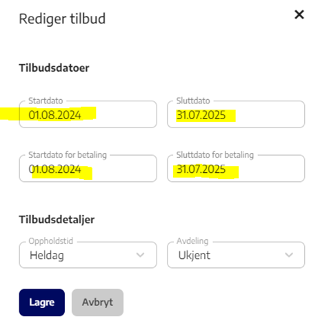 Sjekk at «Startdato for tilbud» er den dagen du kan tilby plass fra, hvis ikke må du endre til riktig dato før du lagrer innstillingen.