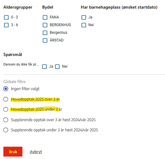 Barnehagemyndigheten oppretter Globale filtre (Forhåndsdefinerte ventelister ) til hvert opptak; supplerende opptak, overflyttingsopptak og hovedopptak. De forhåndsdefinerte ventelistene til supplerende opptak vil alltid være tilgjengelige. Forhåndsdefinerte ventelister til overflyttingsopptak og hovedopptak blir det sendt ut egen informasjon om når de er tilgjengelige.