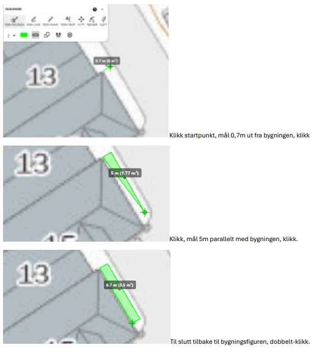 For å kunne beregne leiekostnad for kommunal grunn, må alle slike søknader inneholde et areal. Til dette bruker du dette tegneverktøyet: