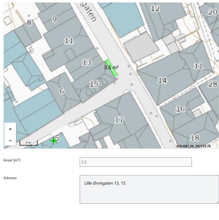 Resultatet er et rektangulært areal på 3,5 kvadratmeter. Arealet fylles automatisk ut i rubrikken under kartet. Det samme gjør berørte gateadresser - ofte vises også adresse til naboeiendom(mer)