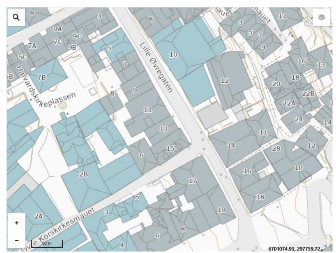 Før du velger verktøy, zoomer og panorerer du deg inn til det stedet på kartet søknaden gjelder. Det er også mulig å søke etter sted ved å bruke søkeknappen øverst i det venstre hjørnet.